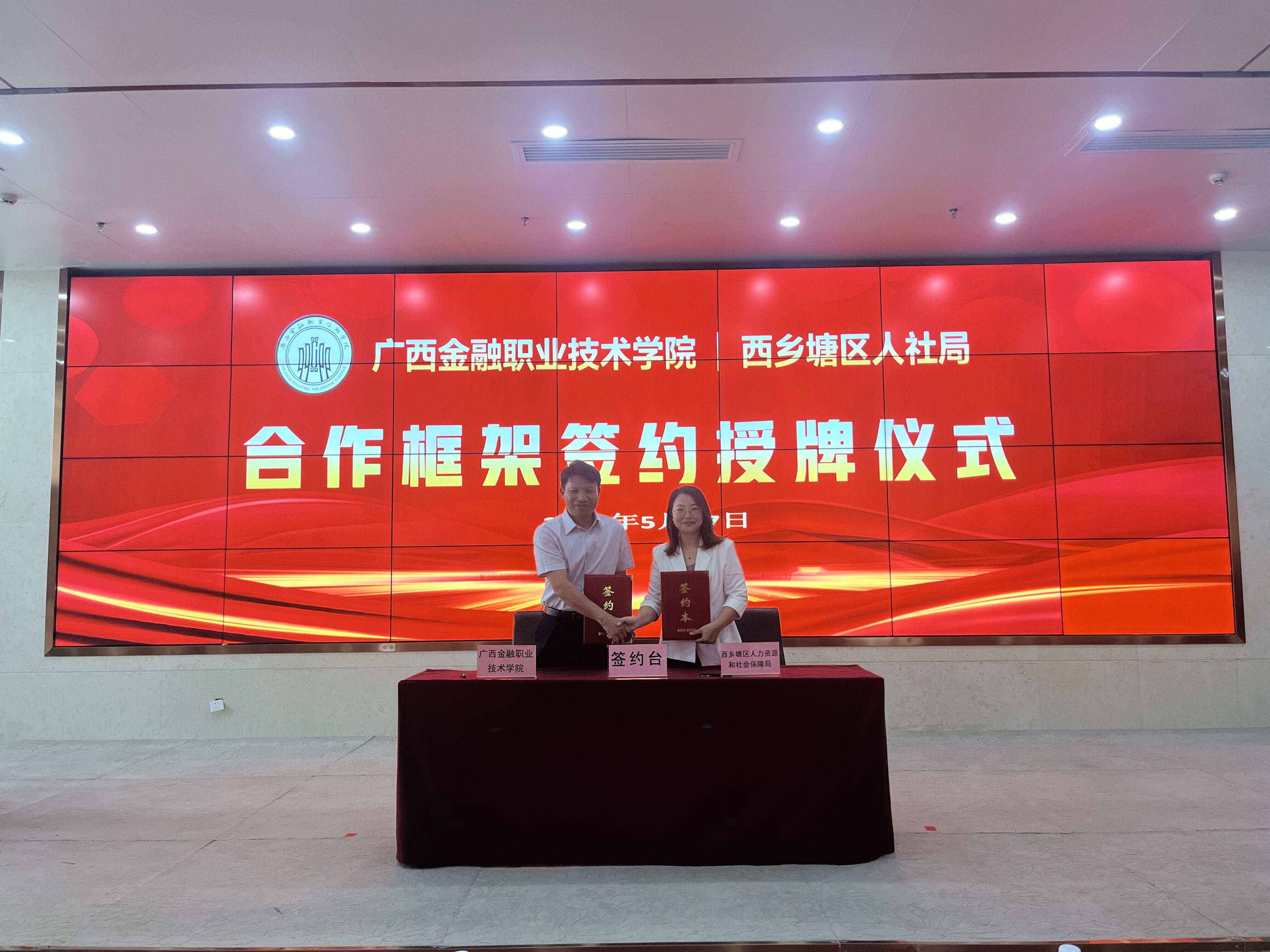 為推動用人單位與畢業生高效精準雙向對接,助力畢業生更加充分更高質量就業,5月27日,學校與南寧市西鄉塘區人力資源和社會保障局在我校西校區舉辦“火熱青春·就在西鄉塘”2025年廣西金融職業技術學院&西鄉塘區人社局合作框架簽約授牌儀式暨校園招聘會。學校黨委副書記、紀委書記劉華政、西鄉塘區人社局局長蘇岸芷出席本次活動并簽署校政合作協議。西鄉塘區人社局、企業代表和學校招生就業處、校團委、各二級學院100多名師生代表參加此次簽約授牌儀式。