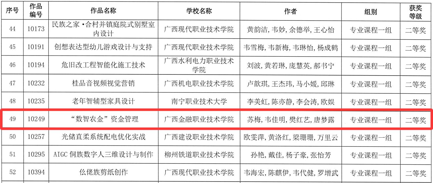 其中,廣西金融職業技術學院派出的兩支參賽團隊憑借出色的課程設計和扎實的教學基本功,雙雙榮獲二等獎;廣西銀行學校派出的兩支團隊也表現突出,均獲得三等獎。