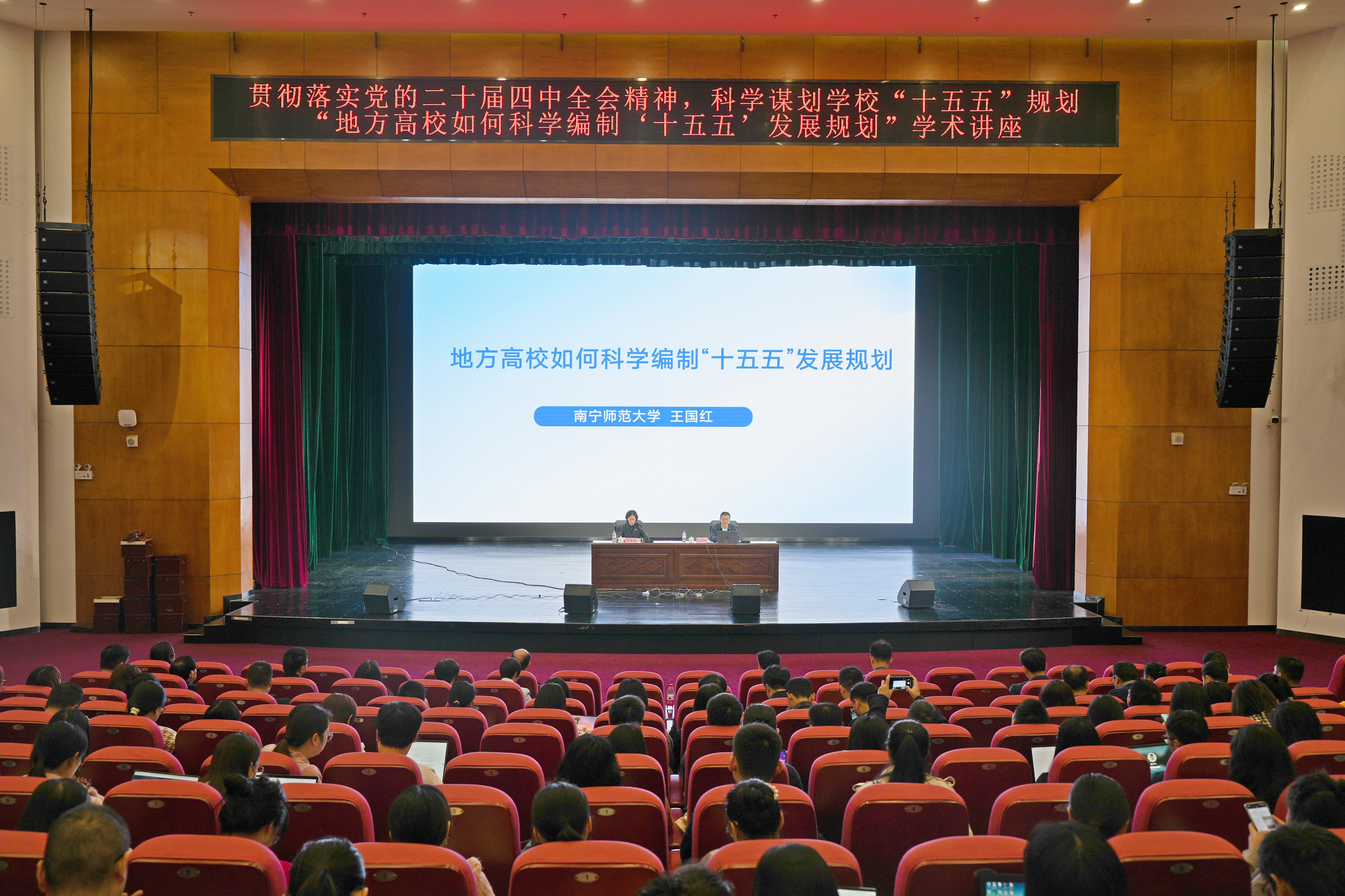 為貫徹落實黨的二十屆四中全會精神,科學謀劃我校“十五五”規劃,2025年11月11日上午,我校第三期“金師?大講堂”系列主題講座在國際會議中心順利舉行。本次講座以“地方高校如何科學編制‘十五五’發展規劃”為主題,特邀中國政治學會常務理事、中國服務貿易協會專家委員會副理事長、南寧師范大學副校長王國紅教授擔任主講嘉賓,學校校長莫海燕主持,全體教職工參加會議。
