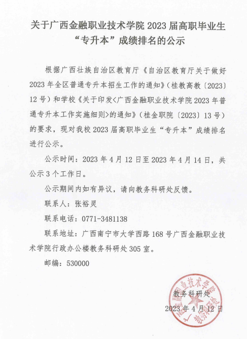 關(guān)于廣西金融職業(yè)技術(shù)學(xué)院2023屆高職畢業(yè)生”專升本“成績排名的公示.pdf