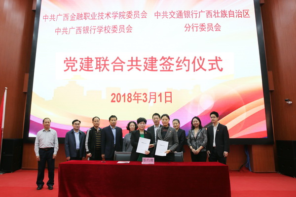 一是黨員活動共同開展,定期以講座、文體活動等形式進行合作交流;二是金融服務共同提供,交行廣西區分行將為我院提供更優質、更有針對性的配套金融服務,搭配黨費管家系統及智慧校園繳費系統、財富論壇等。同時我院推薦優秀學生到銀行網點進行長期實習實踐,并充分運用好所學專業知識,協助銀行共同做好客戶服務;三是先進典型共同樹立,定期聯合表彰部分優秀黨員,樹立先進典型;四是優秀人才共同培養。充分發揮“廣西金融職業技術學院-交通銀行廣西分行校企共建實踐基地”作用,一方面銀行為學校優秀大學生提供日常或假期實踐活動,另一方面,根據銀行需要,學校安排金融、會計等專業老師為銀行相關崗位員工授課,以更好的適應崗位工作需要。五是品牌形象共同塑造。充分發揮雙方宣傳優勢,持續提升雙方品牌形象。