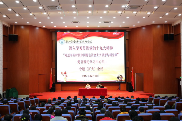 為繼續深入學習黨的十九大精神,加強思想政治工作建設,12月18日下午,學校特邀自治區黨校教授、廣西黨校系統社科聯副主席陳學璞教授為大家做題為《習近平新時代中國特色社會主義思想與新黨章》專題講座。講座由黨委書記沈立君主持。學院全體黨員、科級以上干部、教師入黨積極分子、學生入黨積極分子共320人聆聽講座。