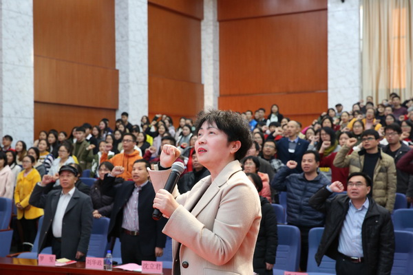 沈立君書記作總結講話。她指出,陳教授的報告立位高遠、內容豐富、講解透徹,既有理論深度又有現實指導作用,對習近平新時代中國特色社會主義思想與新黨章進行了精準闡述,是一堂內容豐富的思想政治教育課,讓在座師生深受教育和啟發。她要求,會后各單位要及時傳達會議的主要內容和精神實質,通過組織專題學習會、研討會、報告會等推動講話精神入心入腦,使廣大師生更加自覺地深入理解和掌握習近平新時代中國特色社會主義思想與新黨章內容。一是要提高政治站位,充分認識學習宣傳貫徹黨的十九大精神的重要意義。二是要廣泛宣傳發動,大力營造學習宣傳貫徹黨的十九大精神的濃厚氛圍。三是要立足學校實際,推動黨的十九大精神在學校落地見效。