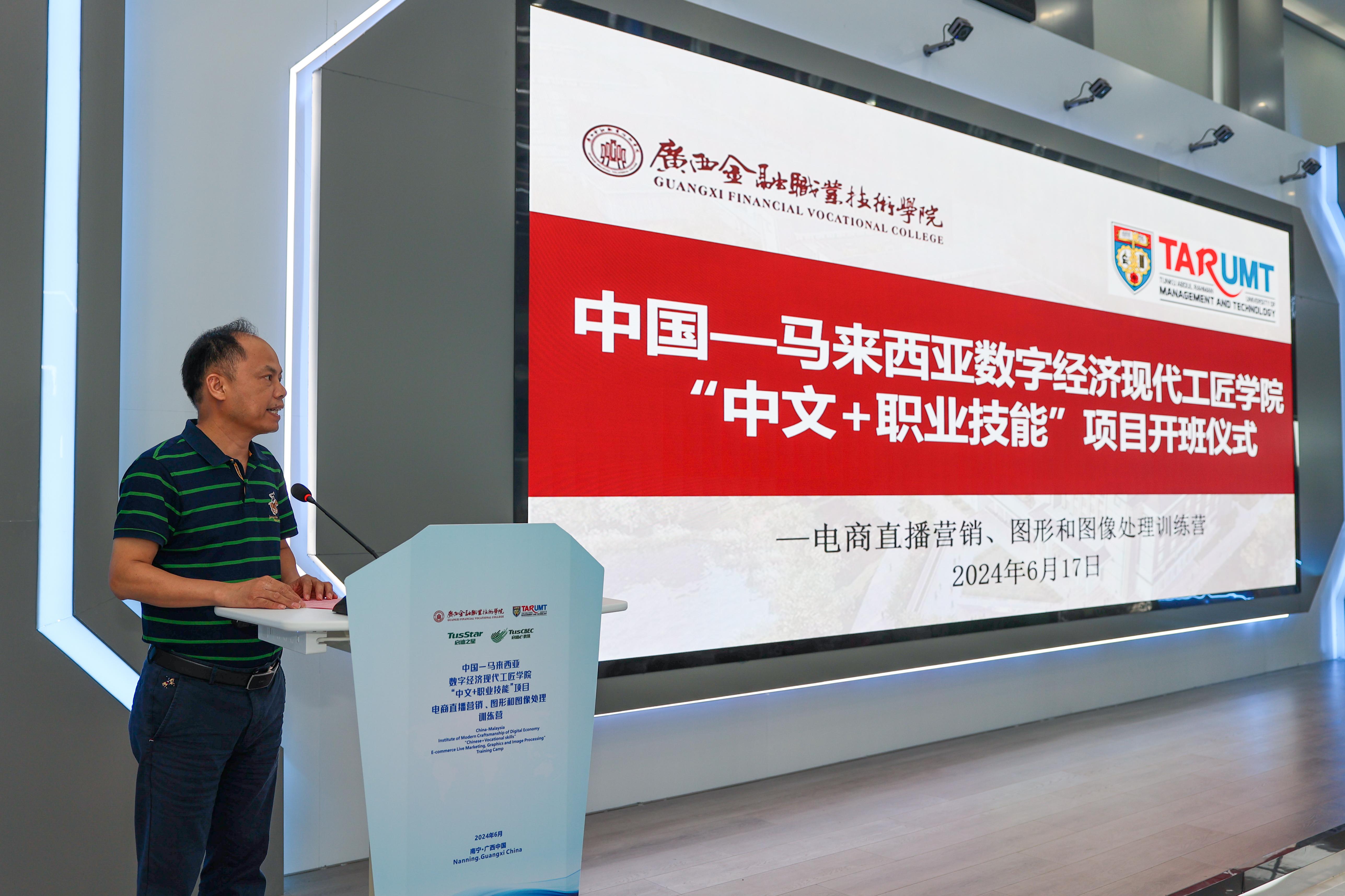 17日上午,中國—馬來西亞數字經濟現代工匠學院“中文+職業技能”項目開班儀式在我校虛擬仿真實訓基地舉行,我校黨委書記李高巖出席并致歡迎詞,拉曼理工大學會計、金融與商業學院院長王祖國及32位師生出席開班儀式,開班儀式由我校副校長謝沛善主持。