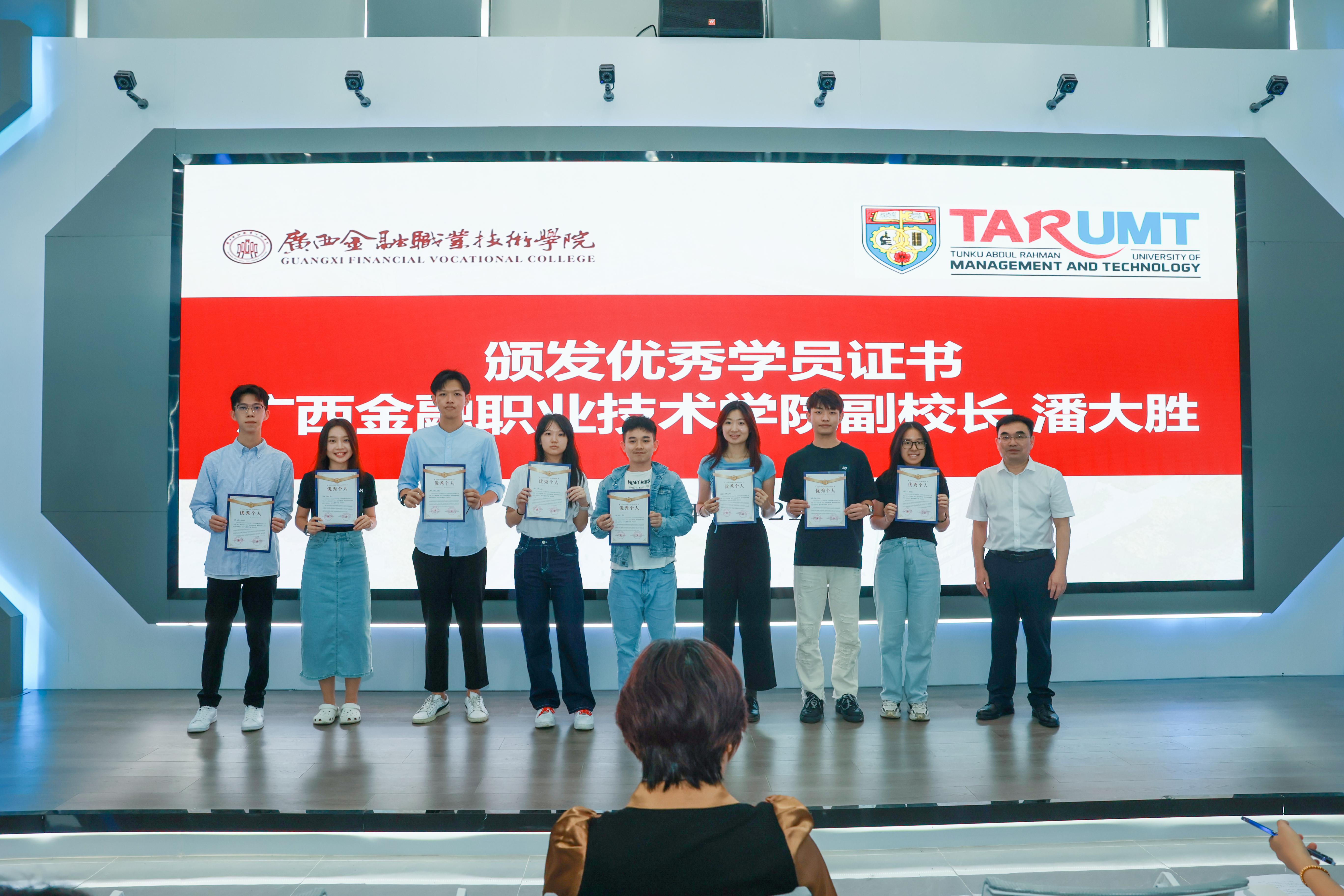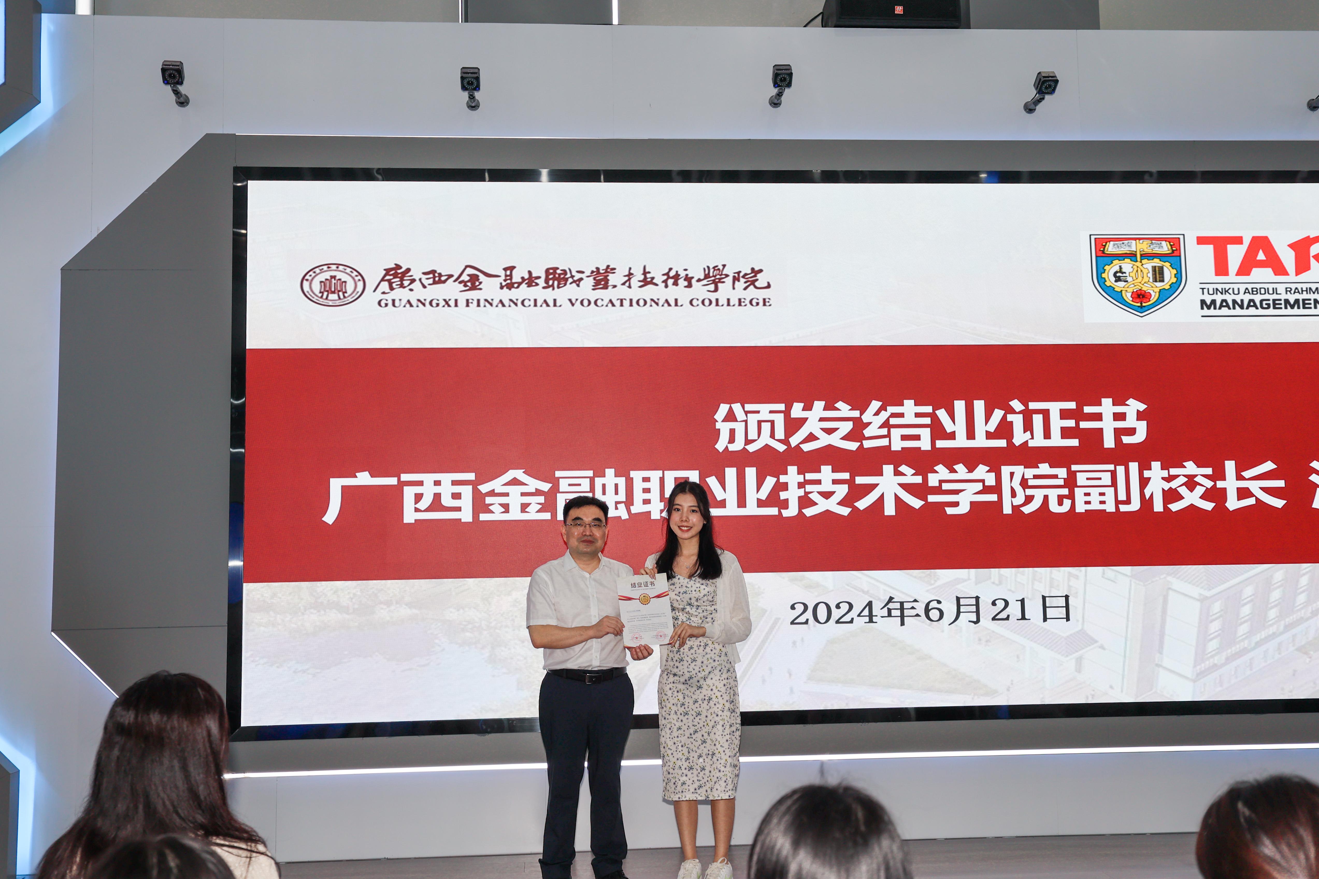 廣西金融職業技術學院副校長為學生代表頒發結業證書
